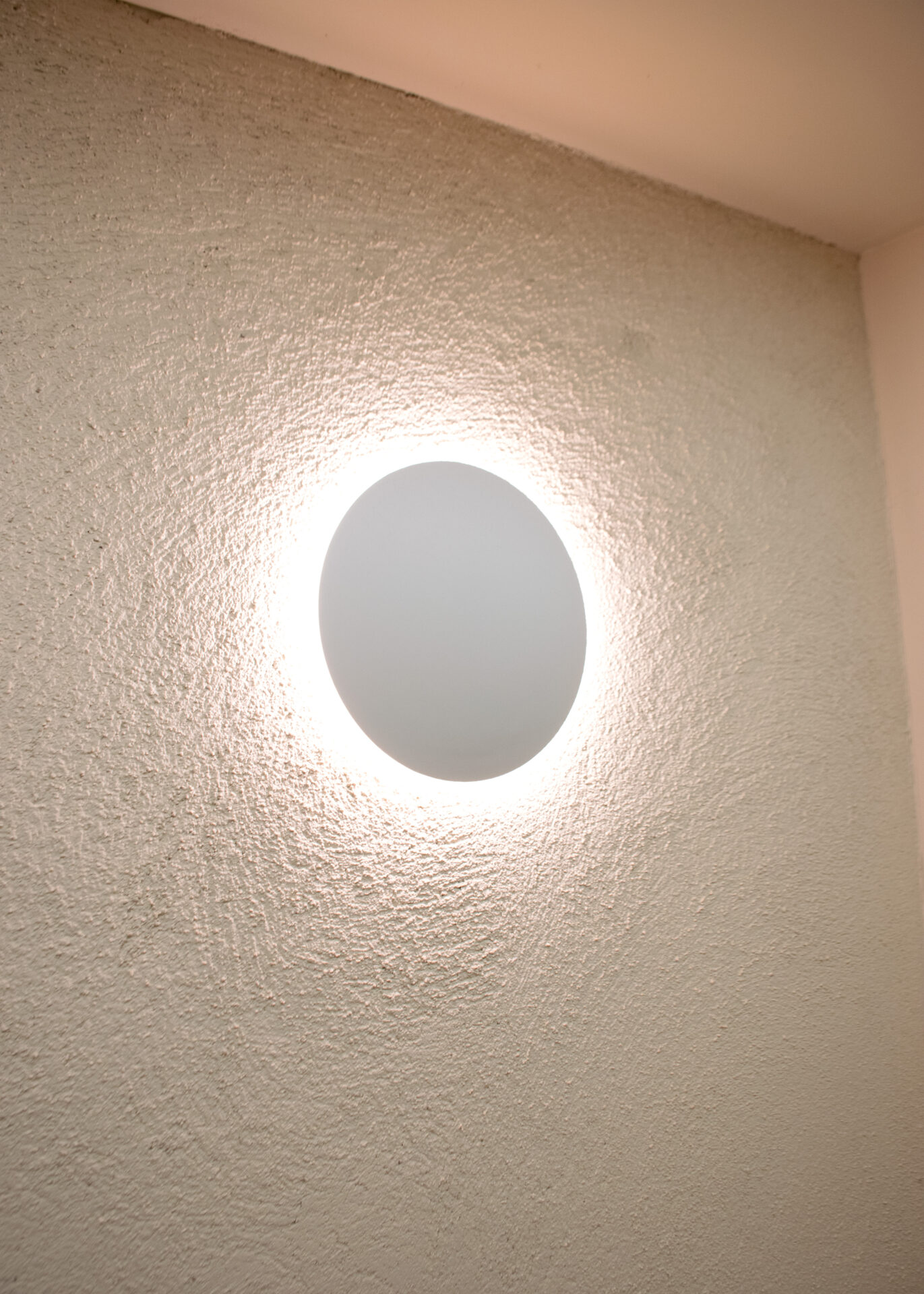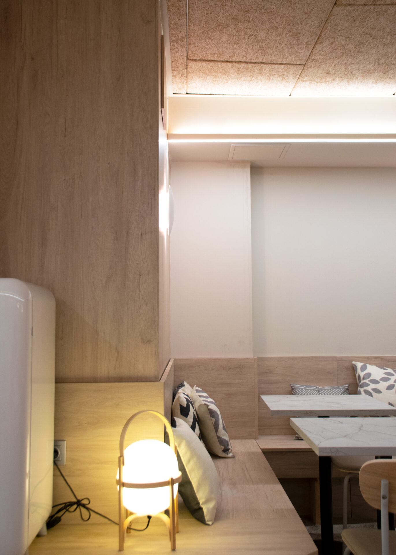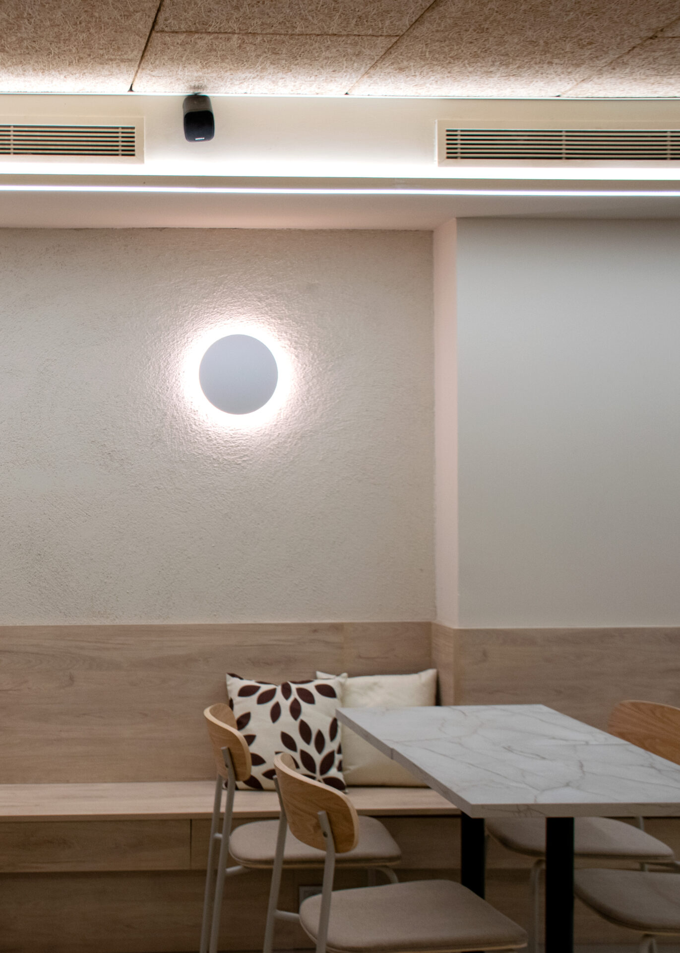 Los materiales elegidos refuerzan la idea de calidez y confort: panelados de madera clara que envuelven el espacio, pavimentos continuos de tono neutro y techos resueltos con paneles acústicos de fibras naturales, que mejoran tanto la atmósfera como la experiencia sonora. La iluminación se convierte en un recurso expresivo: líneas LED integradas en el techo marcan la perspectiva hacia el fondo, mientras que luminarias circulares generan un delicado halo sobre las paredes texturizadas, creando una ambientación íntima y acogedora.