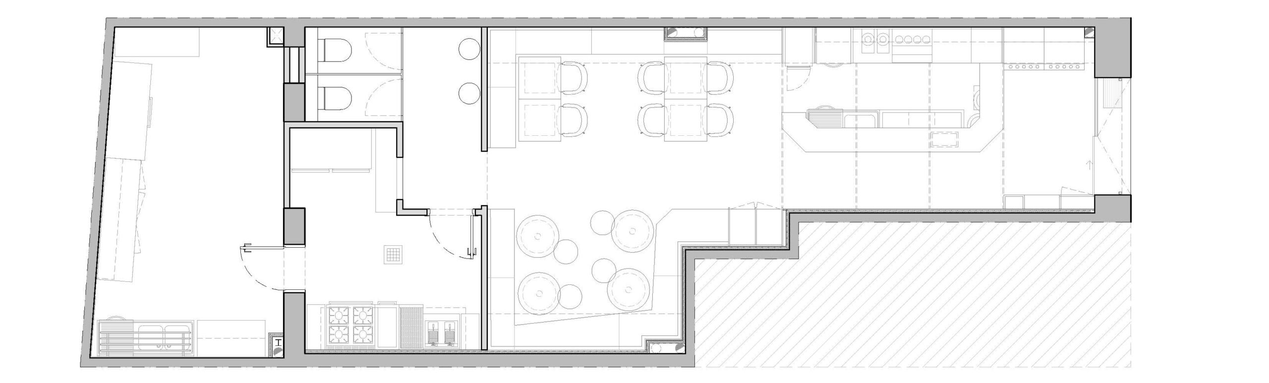 La intervención se plantea a partir de una condición clave: conservar la licencia de actividad existente de un bar histórico, en un contexto urbanístico que ya no permite otorgar nuevas licencias de este tipo. Bajo esta premisa, la distribución original del local se mantiene, pero se transforma por completo su imagen comercial para adaptarse al nuevo propietario y a una clientela contemporánea.