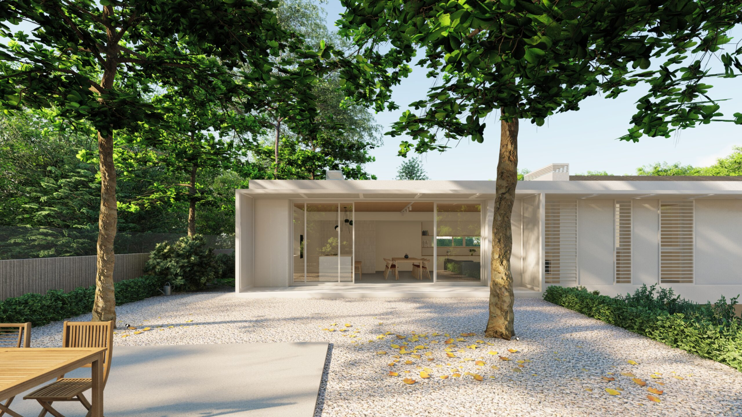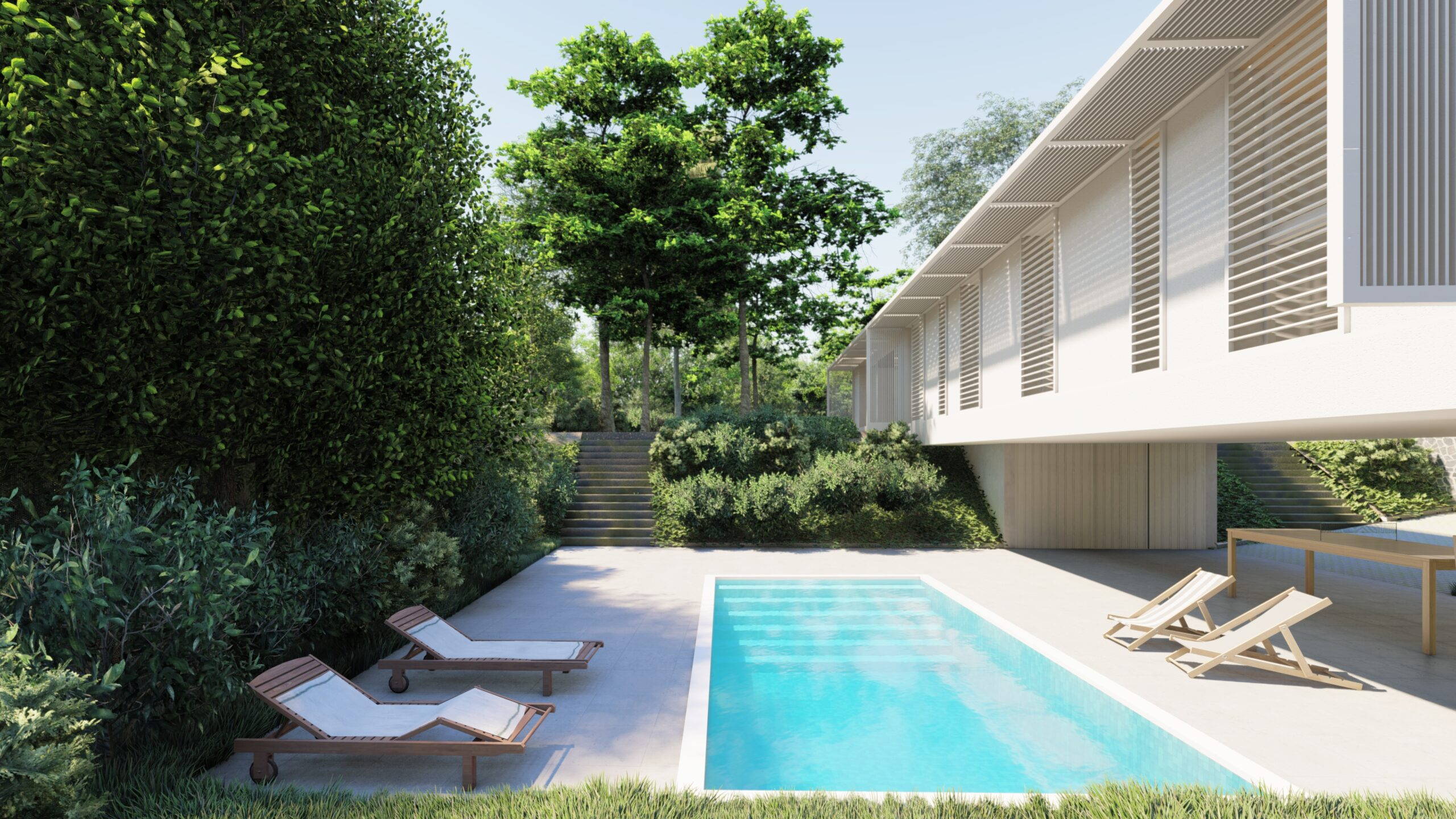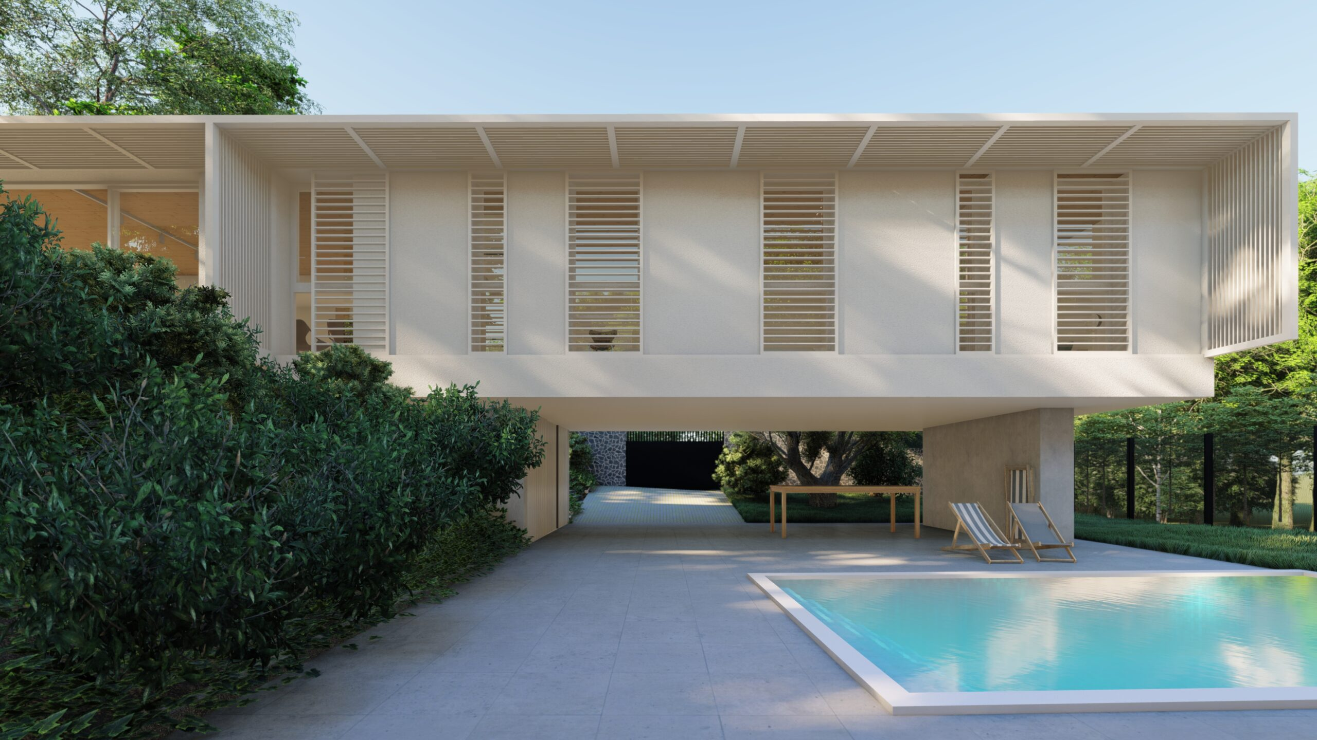 Uno de los elementos más destacados del proyecto es el porche, concebido como un espacio intermedio que aporta sombra y cobijo, y que se proyecta directamente hacia la piscina. Este gesto articula la vida exterior de la casa y potencia su relación con el entorno inmediato.