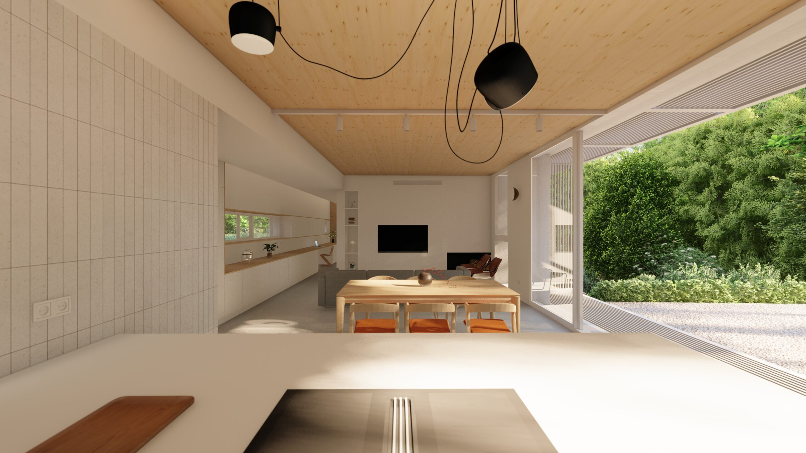 El resultado es una pieza arquitectónica de forma rectangular, que se adapta a la pendiente natural y organiza su acceso principal desde la parte alta de la parcela. Desde allí, la vivienda se abre hacia el paisaje, generando una transición fluida entre el interior y el exterior.
