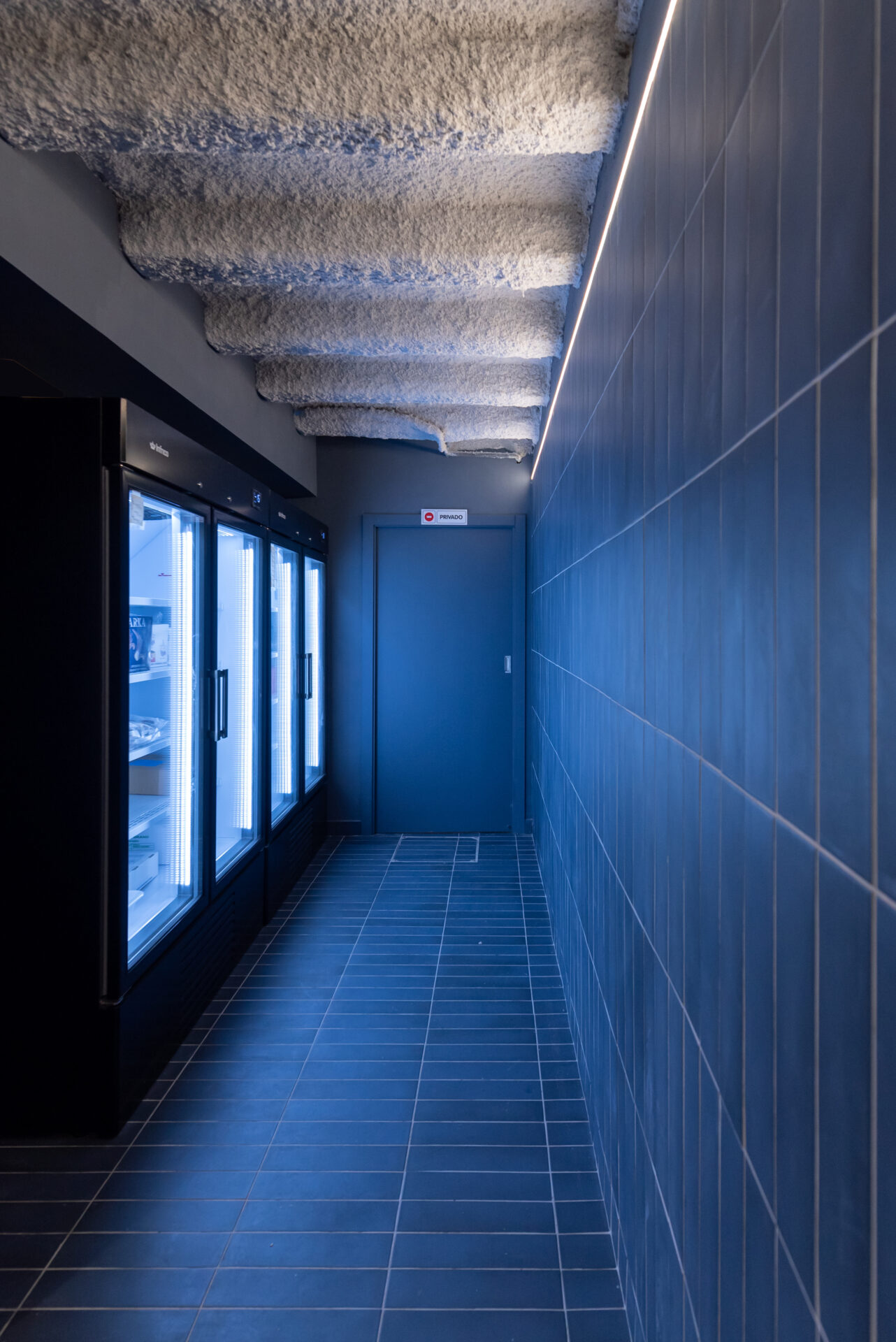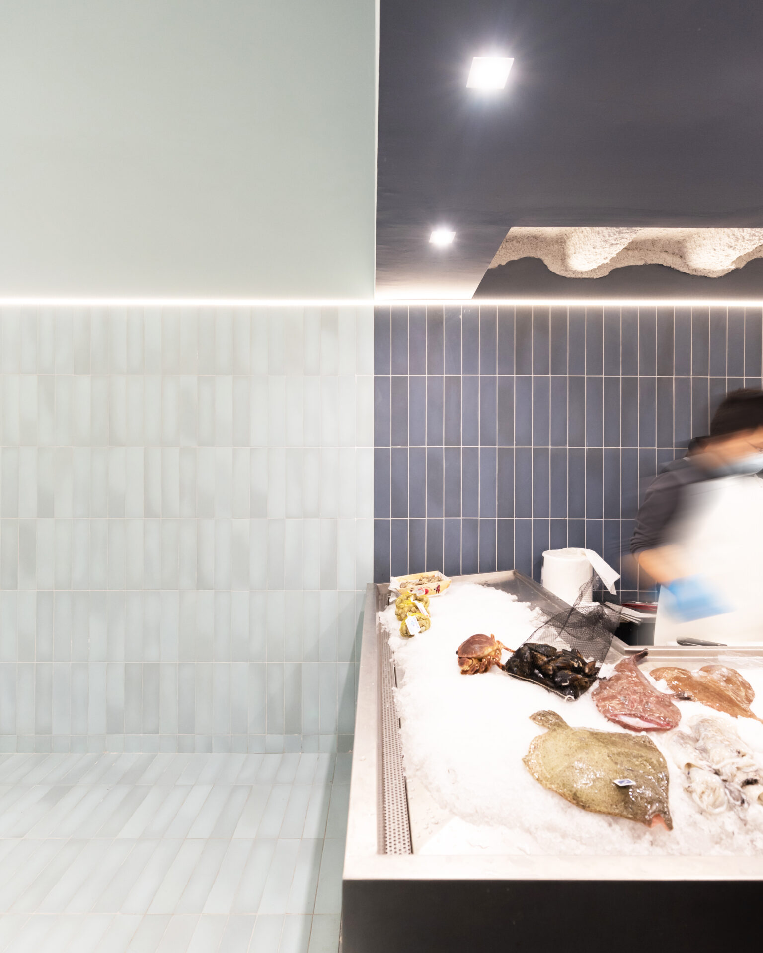 La idea de las dos cajas se enfatiza también en la materialidad. La caja de acceso se reviste con cerámica rectangular en un azul claro que se eleva desde el suelo hasta el techo, mientras que la caja posterior adopta un azul oscuro del mismo formato. Este contraste cromático simboliza la profundidad del mar: desde la superficie más luminosa hacia un interior más profundo e intenso.