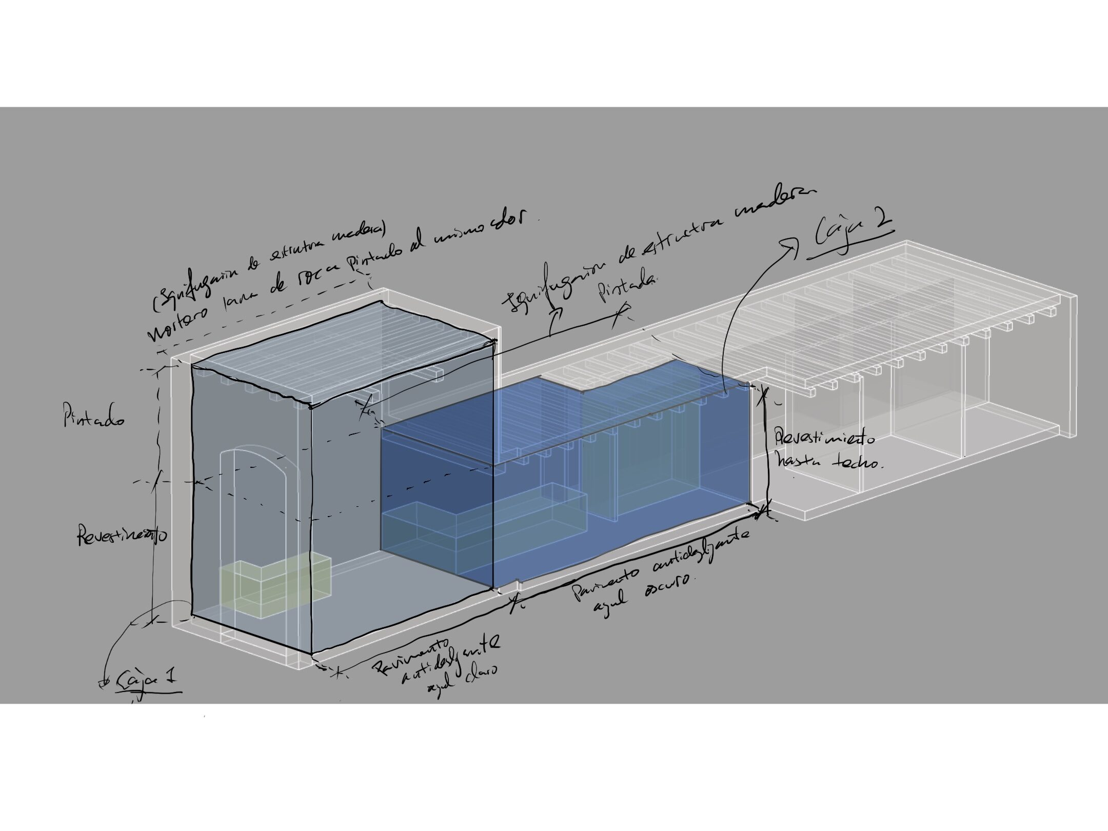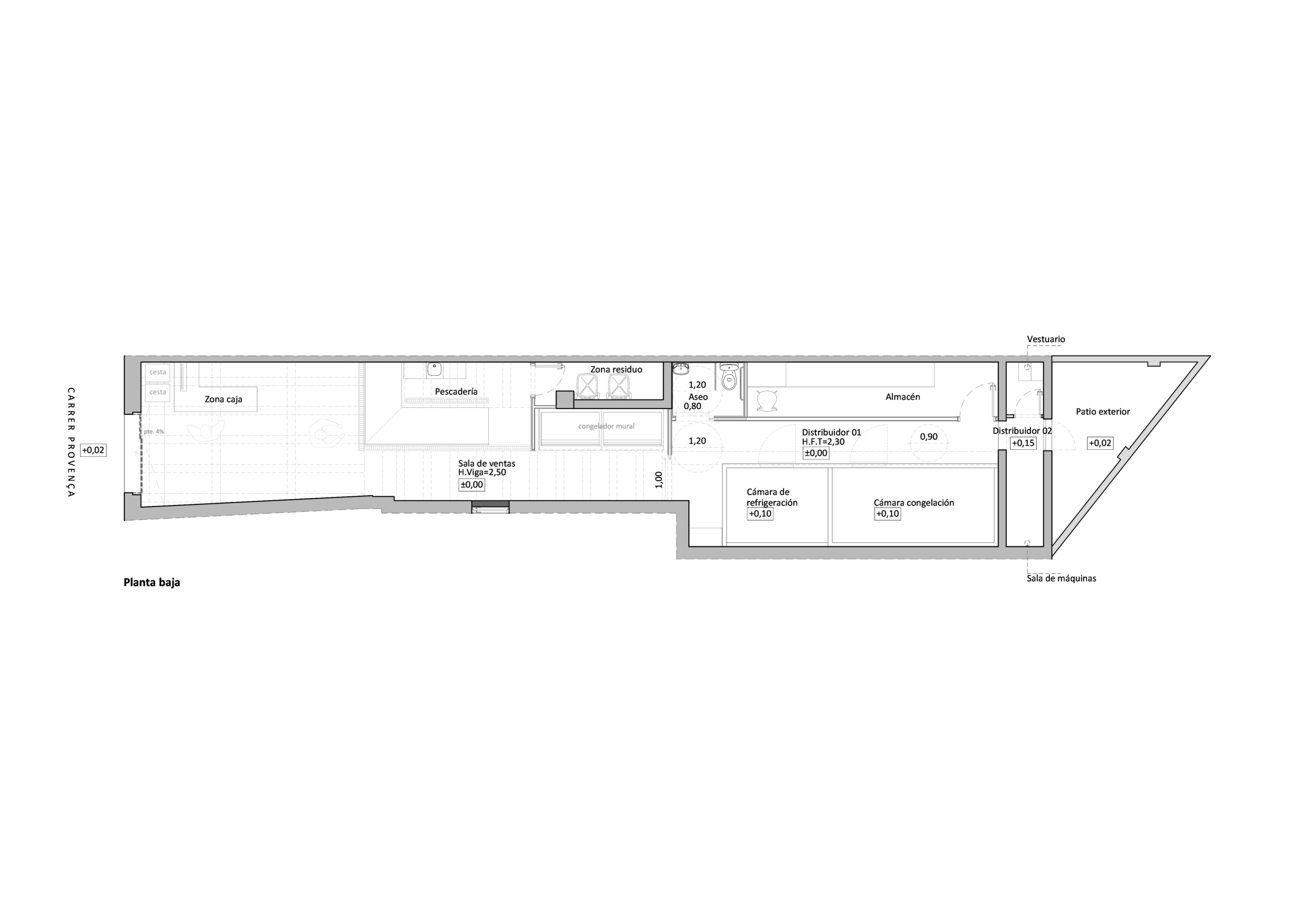 La intervención parte de las condiciones arquitectónicas del local, que definen la estrategia de diseño y distribución. El espacio se organiza a partir de dos cajas claramente diferenciadas: la primera, situada en la parte delantera y con mayor altura, funciona como zona de bienvenida, espera y cobro; la segunda, de altura más reducida, concentra los usos internos vinculados a la actividad —zona de exposición y manipulación del pescado, cámaras frigoríficas, almacenes y oficinas—, garantizando funcionalidad y cumplimiento normativo.